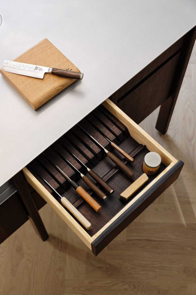 Vollholzschubladen mit Vollauszug und Besteck- und Utensilieneinsatz aus massiver Esche.